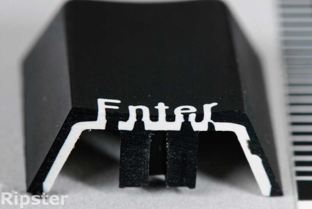 - Laser etching: đơn giản là tia laser sẽ đốt cháy nhựa ở một độ sâu vừa phải, phần nhựa bị cháy sẽ tạo thành kí tự luôn. Phương pháp này thường sử dụng trên keycaps màu trắng.