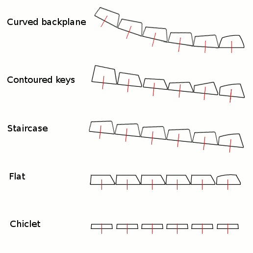 - Staircase: góc của các phím so với chân giống nhau, thân bàn phím thẳng hoặc hơi song song với mặt bàn. Đây là loại phổ biến nhất, giờ ra đâu cũng gặp từ bàn phím membrane cho tới bàn phím cơ.