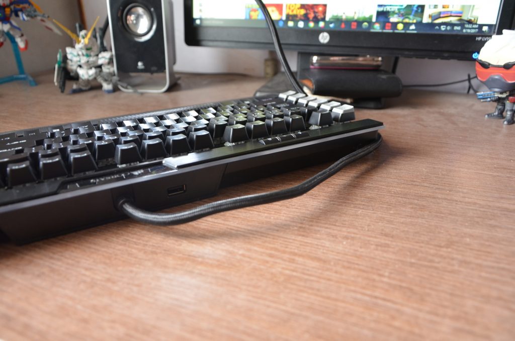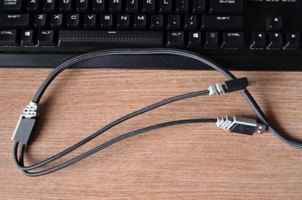 Cáp của K95 Platinum khá dày và cứng vì được bọc rất chắc chắn, có 2 đầu USB bình thường không mạ vàng, một đầu để cho bàn phím, đầu còn lại làm cổng nối với một cổng USB 2.0 trên bàn phím. Cổng này cũng khá tiện, giúp bạn có thể cắm USB chuột hoặc một USB hub nữa mà không cần với tới case.