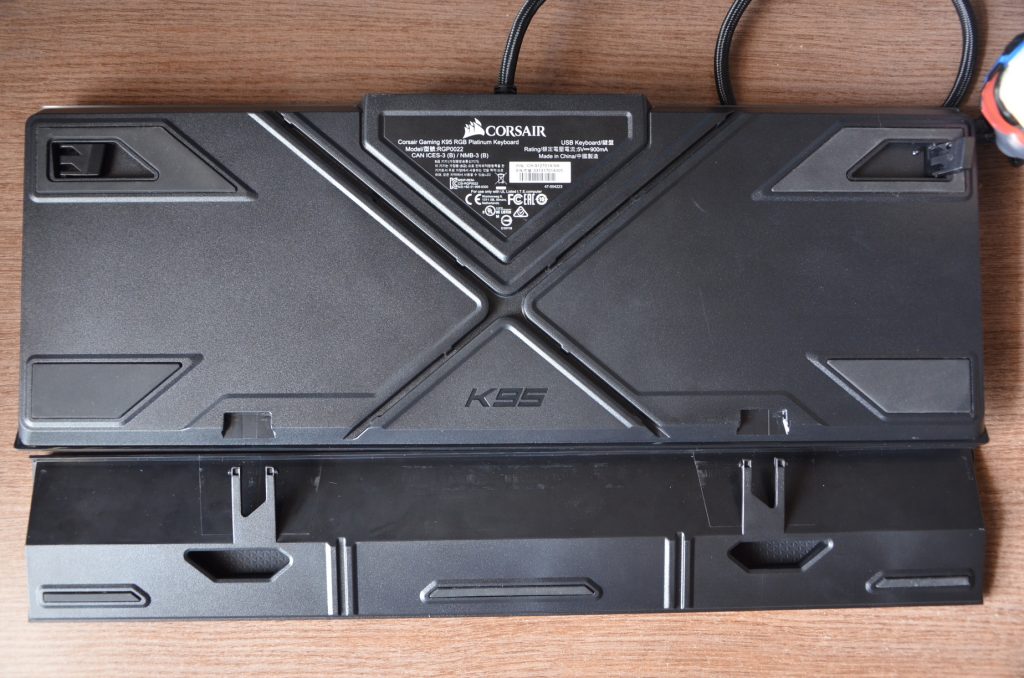 Mặt dưới có 4 feet cao su rất lớn, và 2 chân chống có bọc cao su bật sang ngang – thiết kế giúp cho chân chống không bị gập lại khi bạn đẩy bàn phím lên xuống. Kê tay cũng có 3 feet cao su nhỏ, cũng không có tác dụng nhiều lắm vì feet cao su của bàn phím đã lo hết rồi, nhưng có cũng tốt. Ở giữa có một khe hình chữ X để bạn luồn dây, như dây tai nghe chẳng hạn, như vậy dây nhợ không phải đong đua trước mặt bạn hay trên phím, một thiết kế rất hay và mang tính thực tế cao.