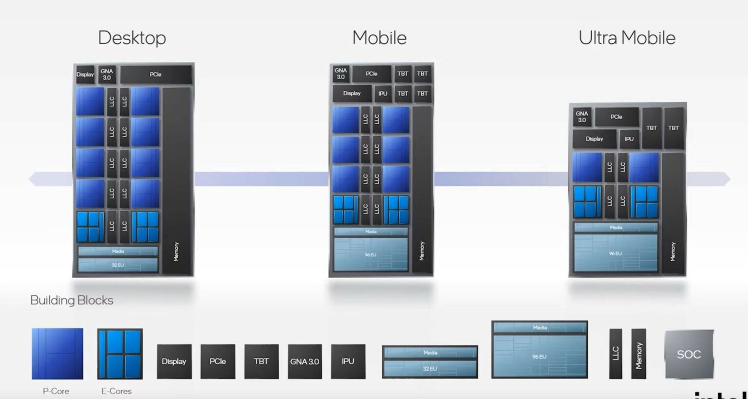 - Alder Lake-M dùng cho mobile, laptop siêu mỏng sẽ có TDP 7W đến 28 W, gồm 2 nhân lớn và 8 nhân nhỏ, iGPU chứa 96 EU.