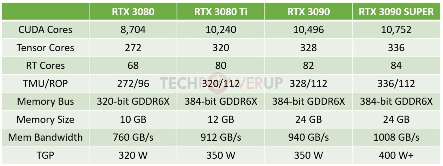 - RTX 3090 SUPER sẽ có 10.752 nhân CUDA, 336 nhân Tensor, 84 nhân RT, 336 TMU, 112 ROP (so với RTX 3090 hiện tại là 10.496 nhân CUDA).