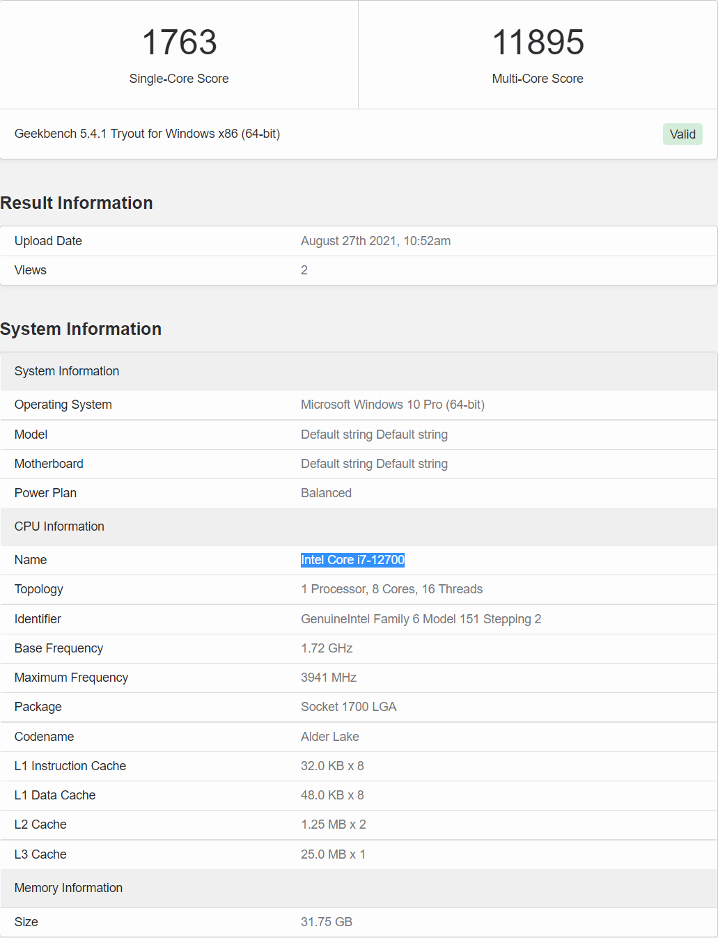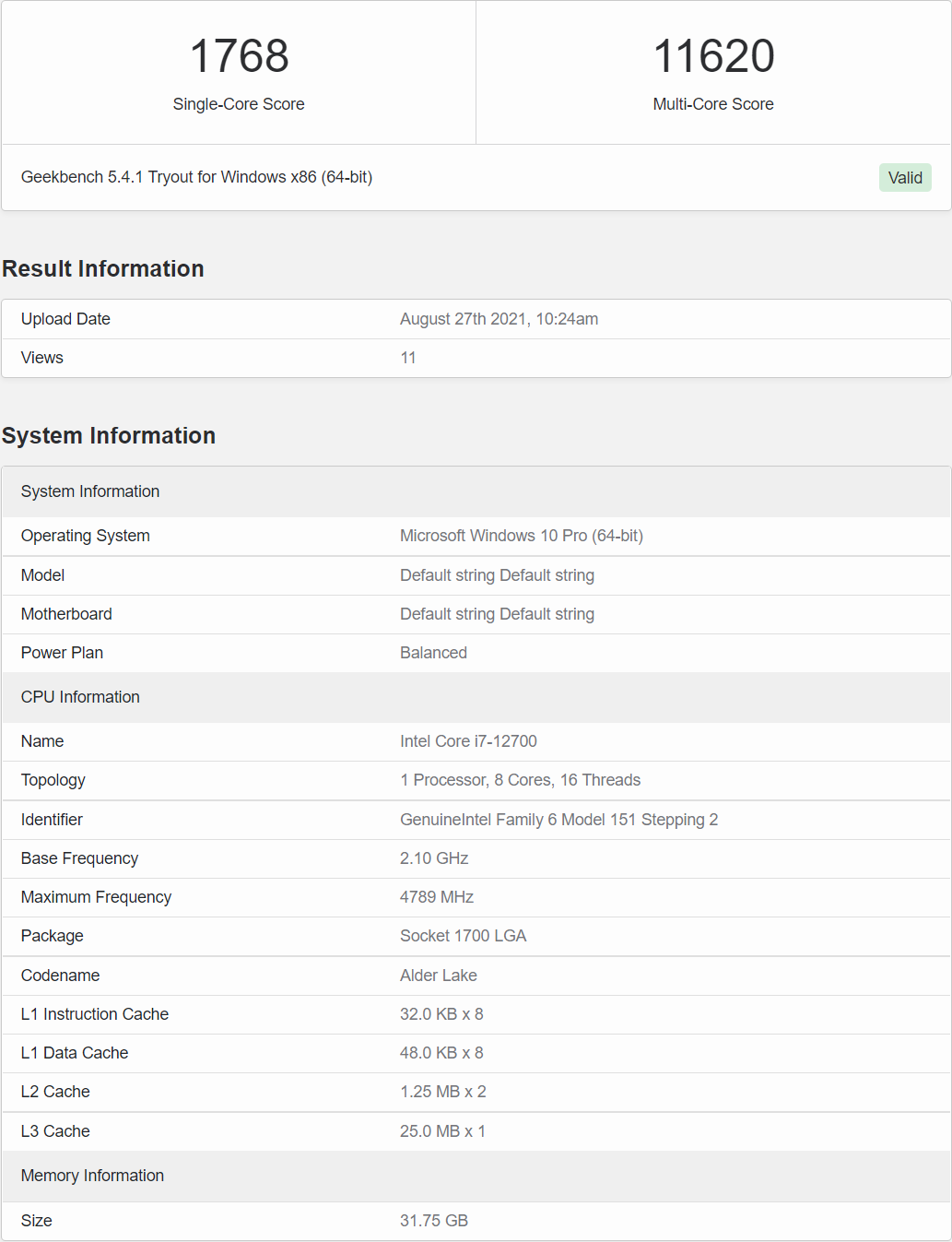 Điểm số benchmark từ Geekbench 5 cho Intel Core i7-12700 (8 nhân 16 luồng, chứ không phải 20 luồng như trong tuyên bố cuối cùng của Intel về thế hệ CPU 12 này). Đây được cho chỉ là bản thử nghiệm nên các kết quả cũng chỉ mang tính tham khảo là chính. Cụ thể các con số đo lường được như sau: